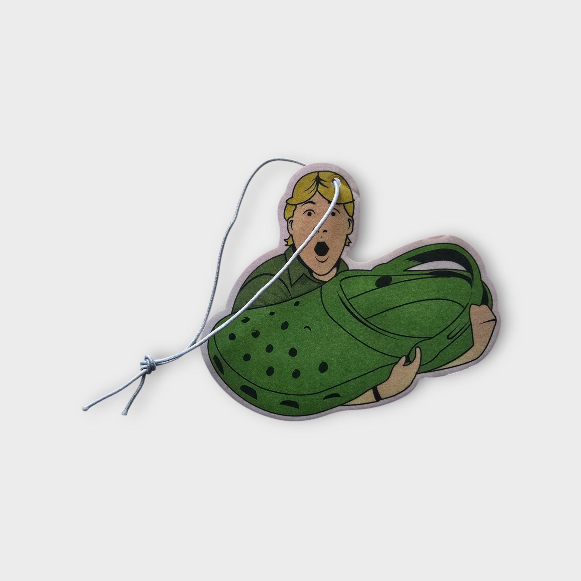 "Add a fun and fresh touch to your drive with our unique car air freshener featuring a playful design of a aussie holding a crocodile-shaped croc shoe, pretending it's a real crocodile. Perfect for those who love humor and quirky style, this air freshener combines delightful scent with a whimsical twist to keep your car smelling great and looking lively."
